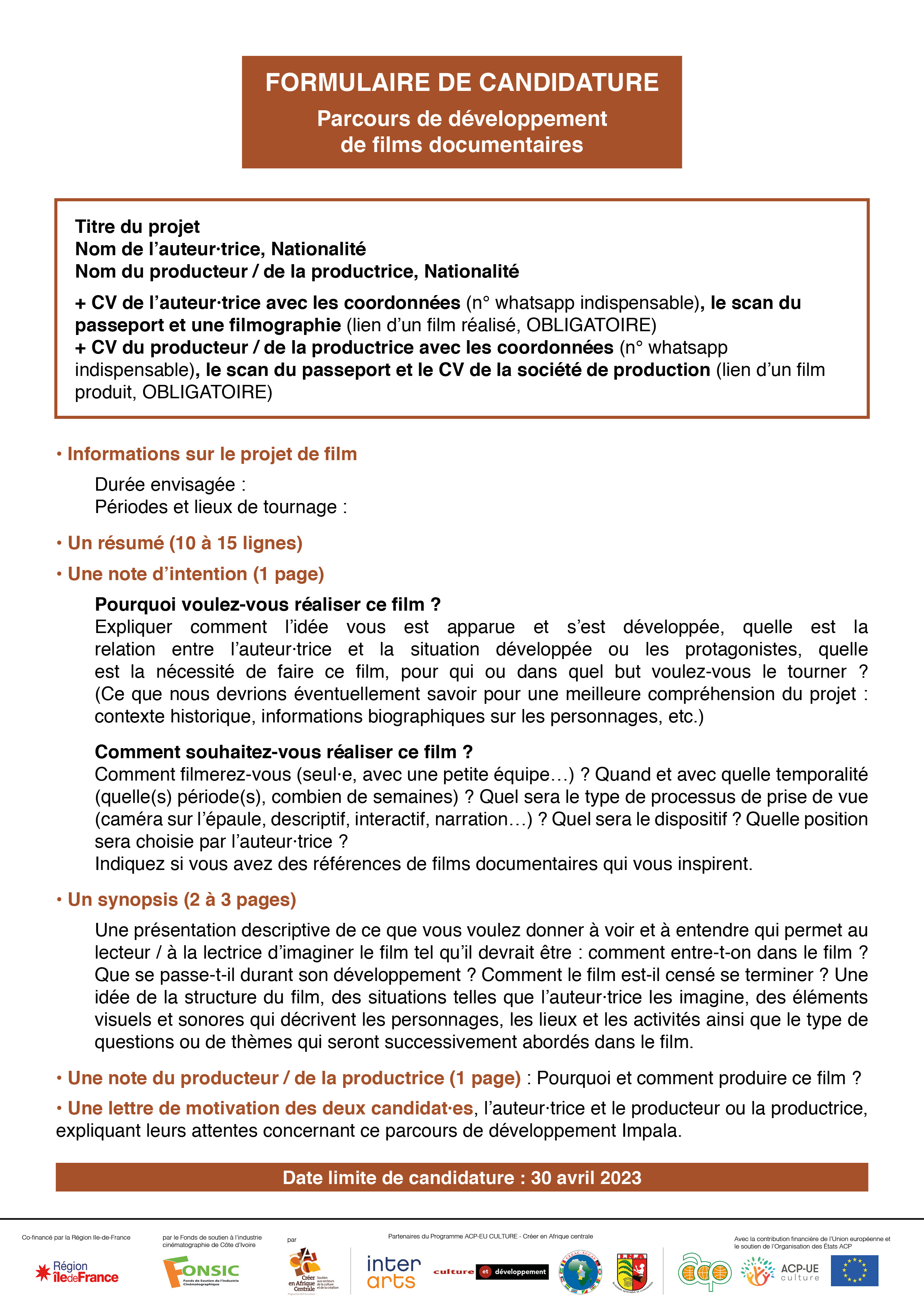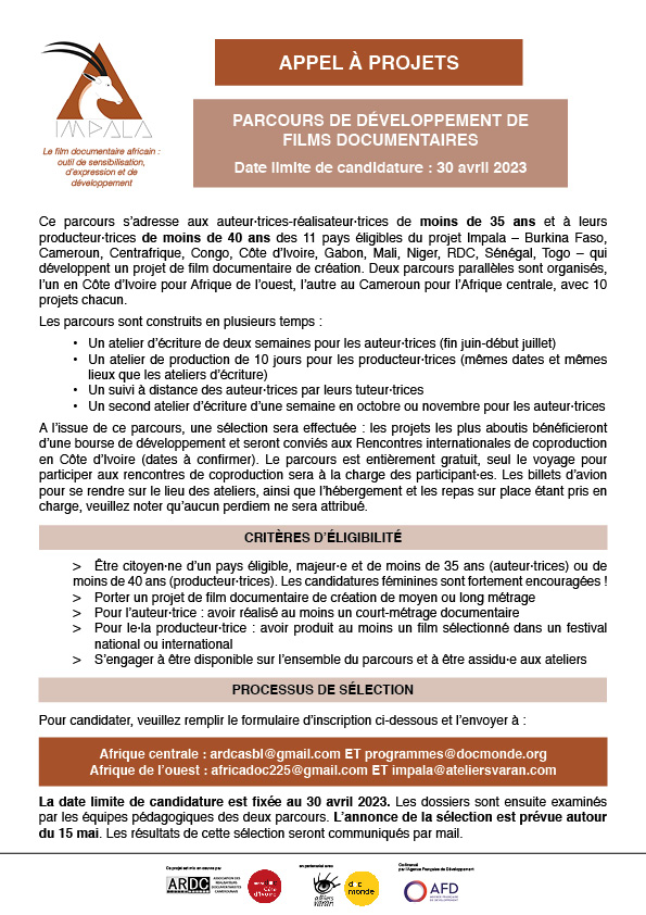 Ce parcours s’adresse aux auteur·trices-réalisateur·trices et à leurs producteur·trices des 11 pays éligibles du projet Impala – Burkina Faso, Cameroun, Centrafrique, Congo, Côte d’Ivoire, Gabon, Mali, Niger, RDC, Sénégal, Togo – de moins de 40 ans, qui développent un projet de film documentaire de création. Deux parcours parallèles sont organisés, l’un en Côte d’Ivoire pour Afrique de l’ouest, l’autre au Cameroun pour l’Afrique centrale, avec 10 projets chacun.