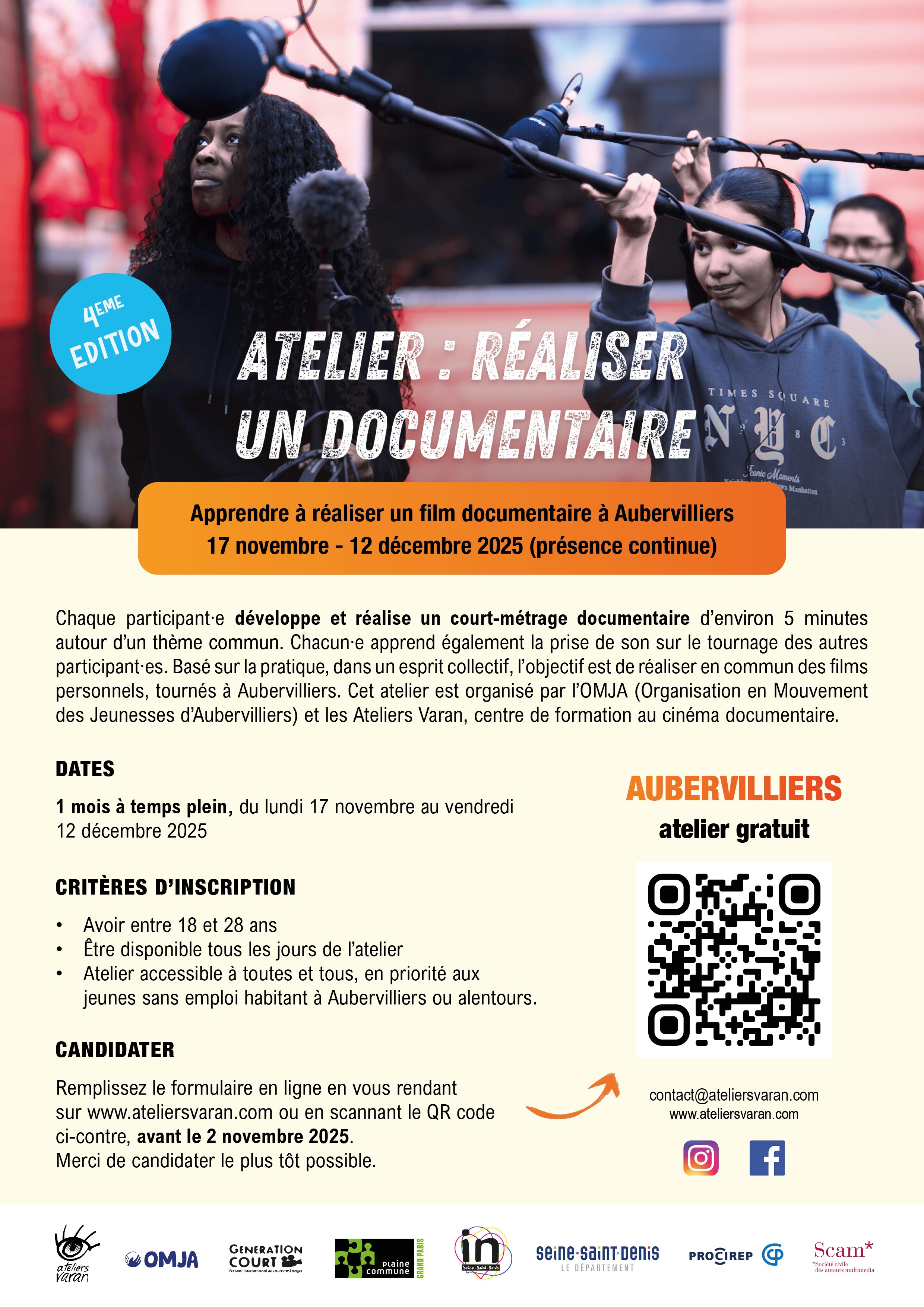 Chaque participant·e développe et réalise un court-métrage documentaire d’environ 5 minutes autour d’un thème commun. Chacun·e apprend également la prise de son sur le tournage des autres participant·es. Basé sur la pratique, dans un esprit collectif, l’objectif est de réaliser en commun des films personnels, tournés à Aubervilliers. Cet atelier est organisé par l’OMJA (Organisation en Mouvement des Jeunesses d’Aubervilliers) et les Ateliers Varan, centre de formation au cinéma documentaire.