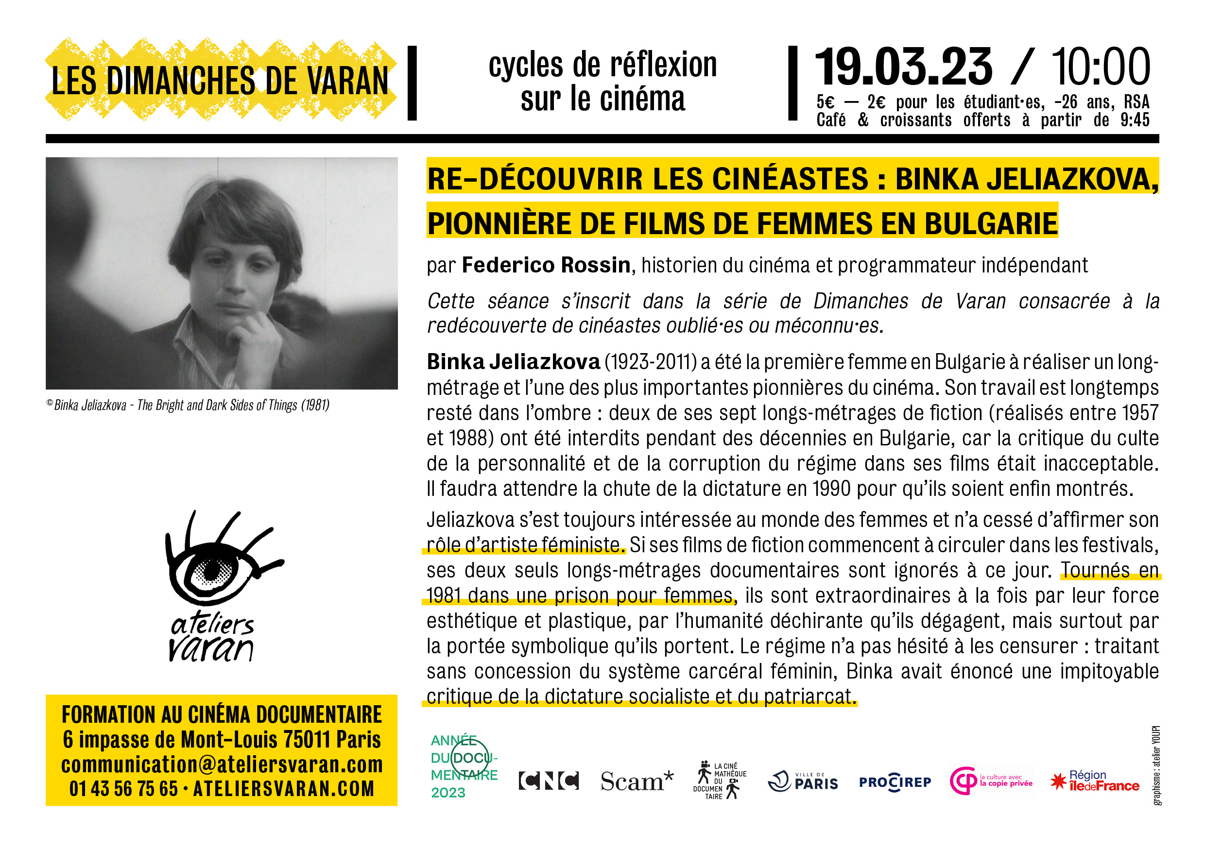 Binka Jeliazkova (1923-2011) a été la première femme en Bulgarie à réaliser un long-métrage et l’une des plus importantes pionnières du cinéma. Son travail est longtemps resté dans l’ombre : deux de ses sept longs-métrages de fiction (réalisés entre 1957 et 1988) ont été interdits pendant des décennies en Bulgarie, car la critique du culte de la personnalité et de la corruption du régime dans ses films était inacceptable. Il faudra attendre la chute de la dictature en 1990 pour qu’ils soient enfin montrés. Jeliazkova s’est toujours intéressée au monde des femmes et n’a cessé d’affirmer son rôle d’artiste féministe. Si ses films de fiction commencent à circuler dans les festivals, ses deux seuls longs-métrages documentaires sont ignorés à ce jour. Tournés en 1981 dans une prison pour femmes, ils sont extraordinaires à la fois par leur force esthétique et plastique, par l’humanité déchirante qu’ils dégagent, mais surtout par la portée symbolique qu’ils portent. Le régime n’a pas hésité à les censurer : traitant sans concession du système carcéral féminin, Binka avait énoncé une impitoyable critique de la dictature socialiste et du patriarcat.