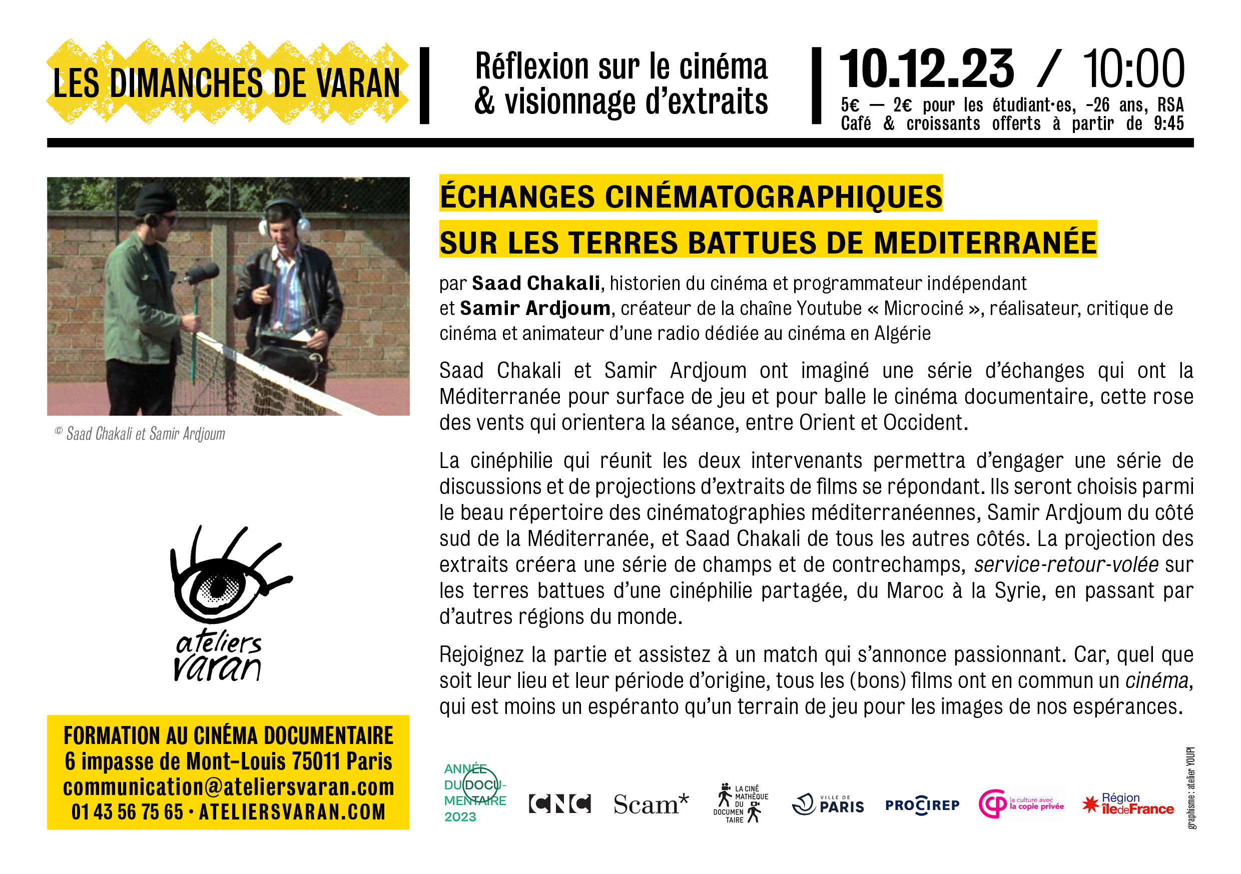 Saad Chakali et Samir Ardjoum ont imaginé une série d’échanges qui ont la Méditerranée pour surface de jeu et pour balle le cinéma documentaire, cette rose des vents qui orientera la séance, entre Orient et Occident.