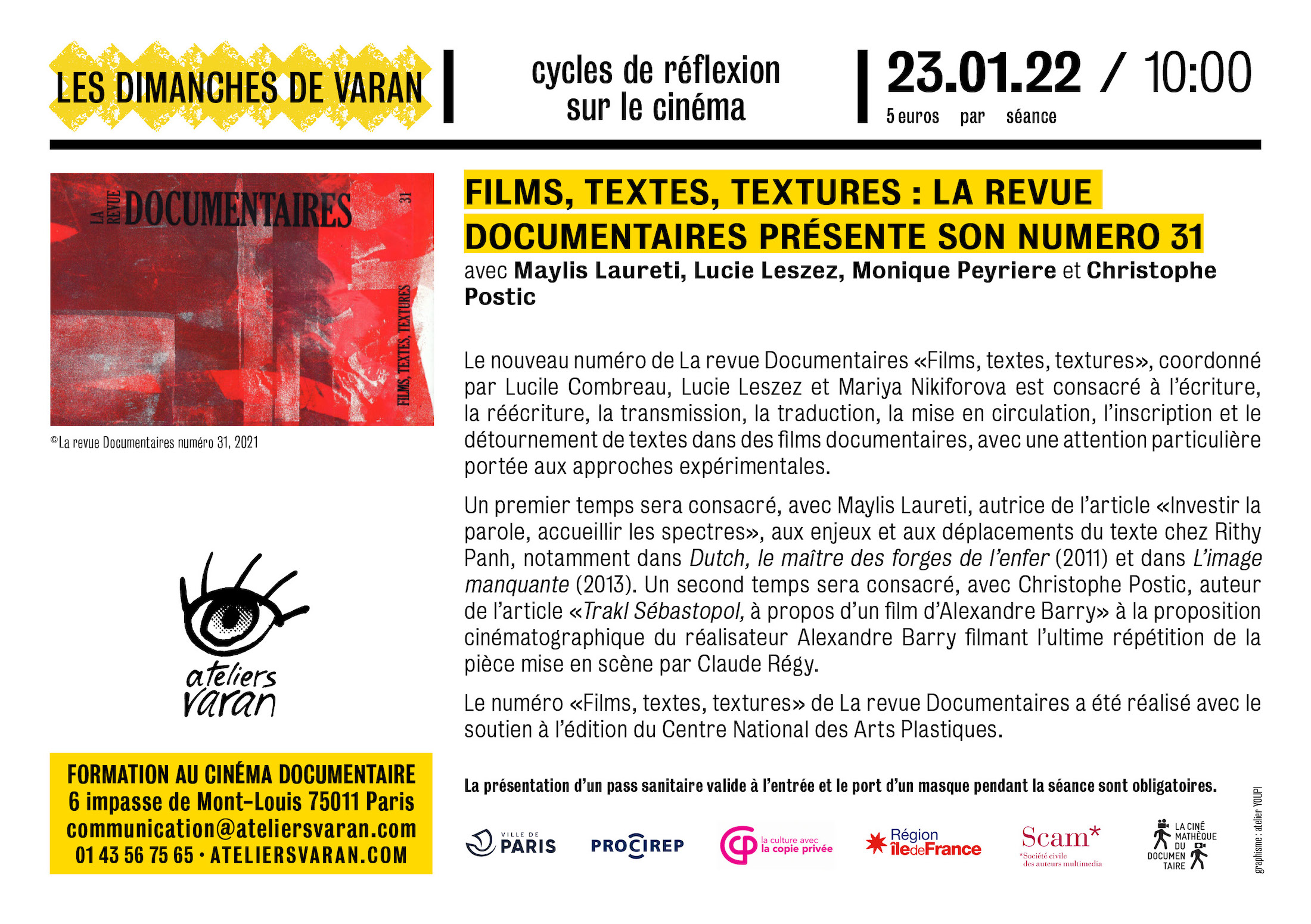 Information importante : en raison de la situation sanitaire, nous maintenons les séances des Dimanches mais nous ne pourrons plus vous servir de café/thé et de croissants. Les séances commenceront donc à 10h précises et se termineront vers 13h, sans pause.