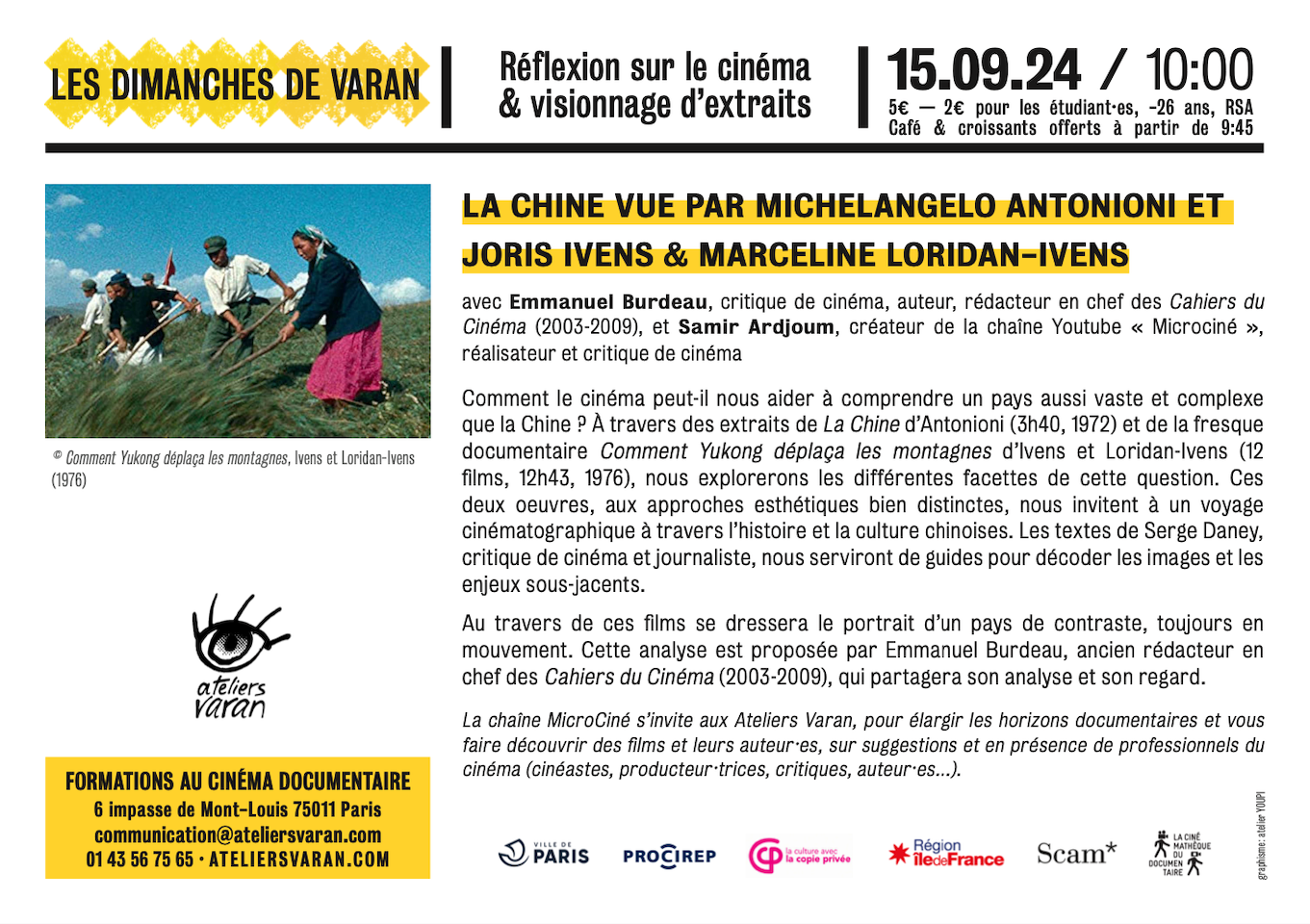 La Chine et Comment Yukong déplaça les montagnes, réalisés avec des approches esthétiques distinctes, nous invitent à un voyage cinématographique à travers l'histoire et la culture chinoise. Lors de ce Dimanche de Varan, nous prendrons appui sur les textes critiques de Serge Daney pour décoder les images et les enjeux sous-jacents. Cette séance présentera comment ces deux films, ces deux regards, questionnent un pays en mouvement.
