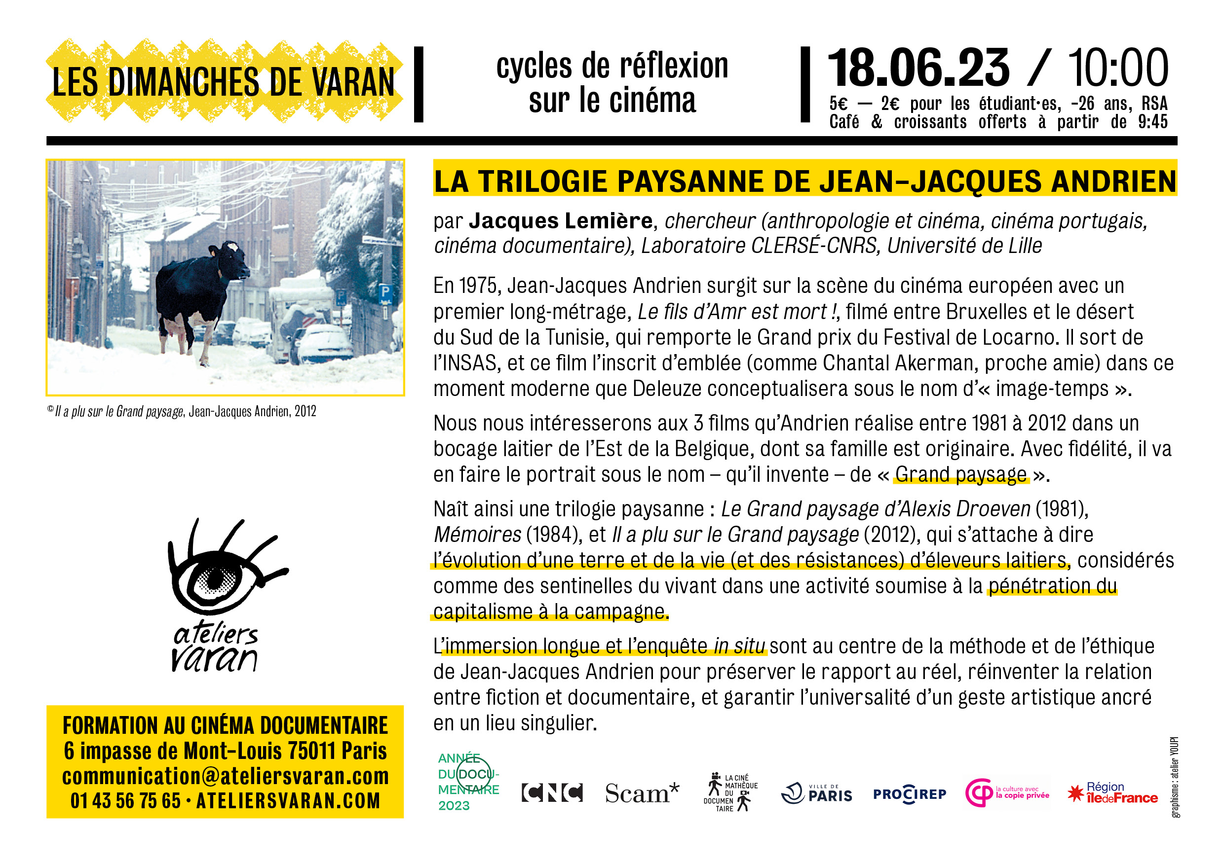 Nous nous intéresserons aux 3 films qu’Andrien réalise entre 1981 à 2012 dans un bocage laitier de l’Est de la Belgique, dont sa famille est originaire. Avec fidélité, il va en faire le portrait sous le nom – qu’il invente – de « Grand paysage ».