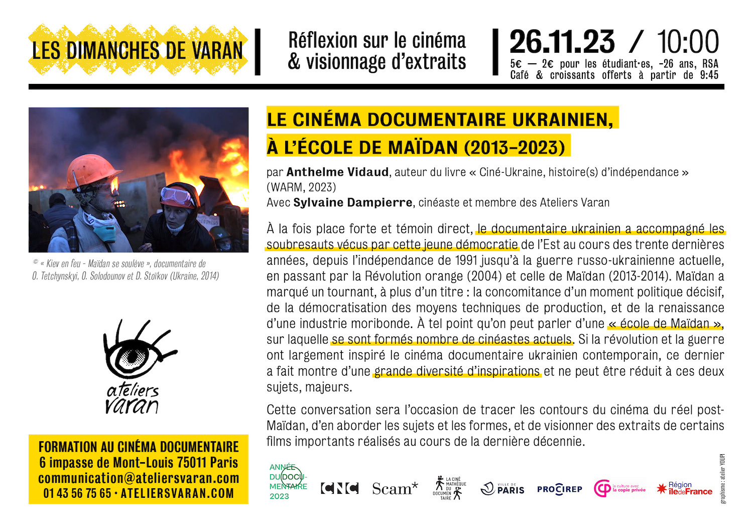 Cette conversation sera l’occasion de tracer les contours du cinéma du réel post- Maïdan, d’en aborder les sujets et les formes, et de visionner des extraits de certains films importants réalisés au cours de la dernière décennie.
