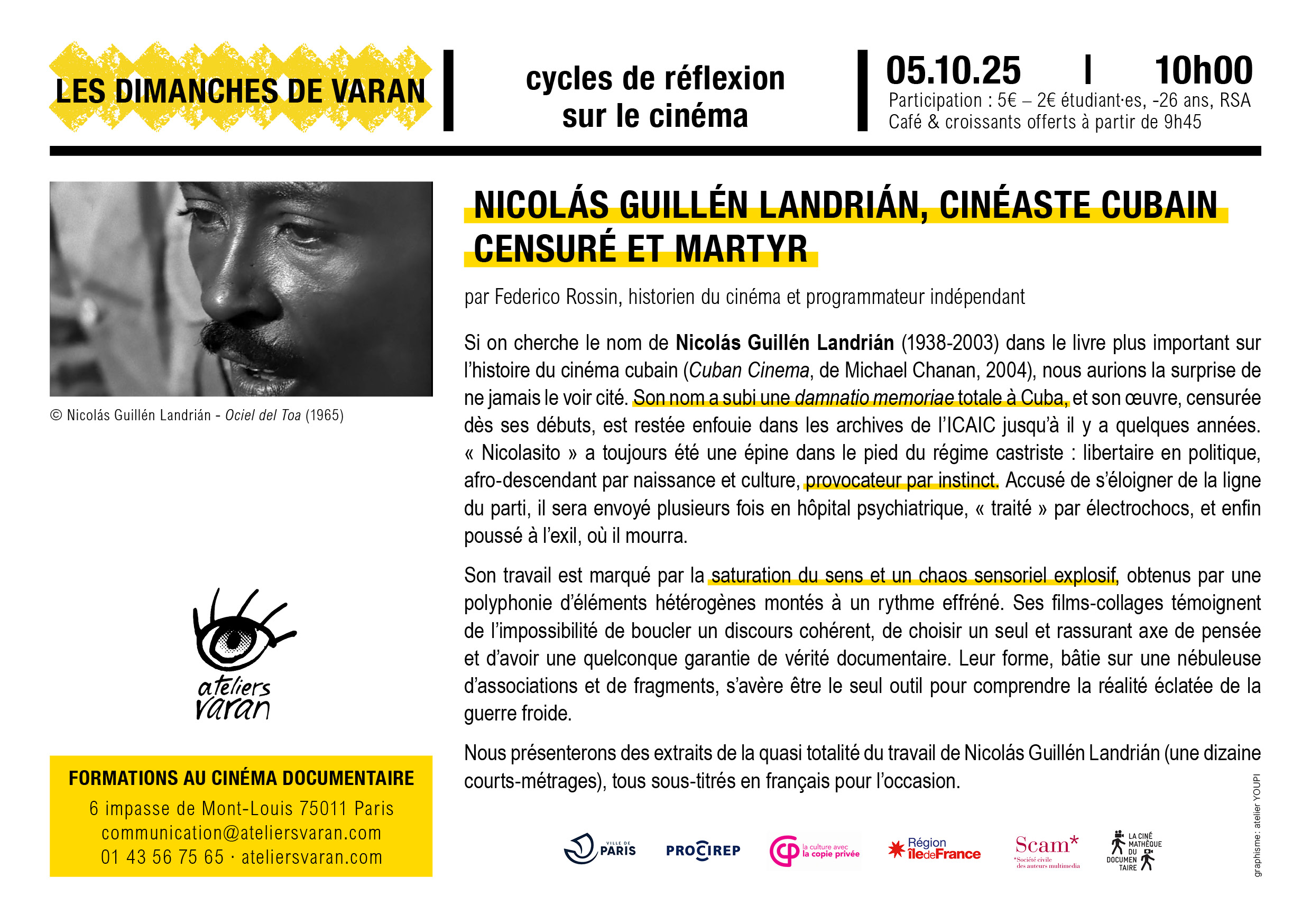 Nous présenterons des extraits de la quasi totalité du travail de Nicolás Guillén Landrián (une dizaine courts-métrages), tous sous-titrés en français pour l’occasion.
