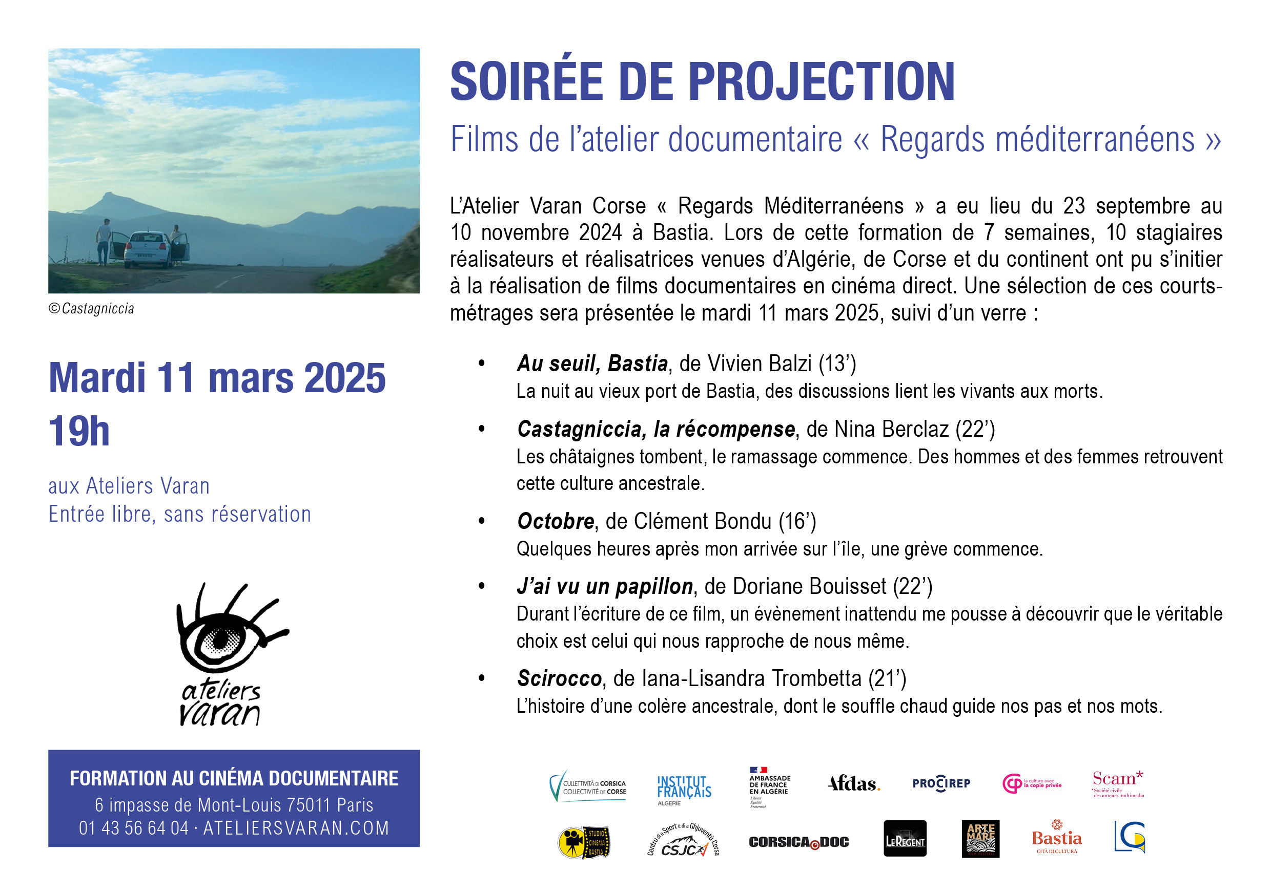 L’Atelier Varan Corse Regards Méditerranéens a eu lieu du 23 septembre au 10 novembre 2024 à Bastia. Lors de cette formation de 7 semaines, 10 stagiaires réalisateurs et réalisatrices venues d’Algérie, de Corse et du continent ont pu s’initier à la réalisation de films documentaires en cinéma direct. Une sélection de ces courts-métrages sera présentée le mardi 11 mars 2025 :