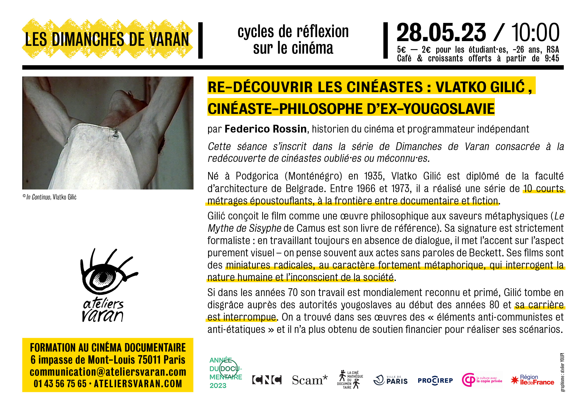 Né à Podgorica (Monténégro) en 1935, Vlatko Gilić est diplômé de la faculté d’architecture de Belgrade. Entre 1966 et 1973, il a réalisé une série de 10 courts métrages époustouflants, à la frontière entre documentaire et fiction.