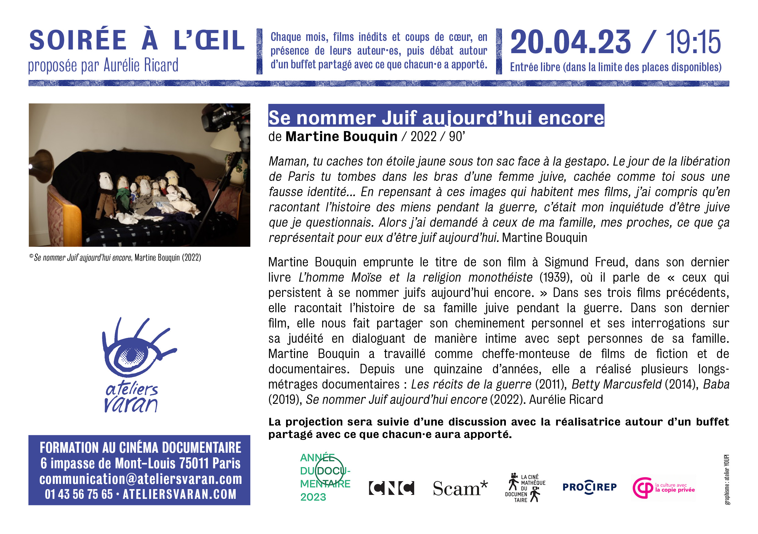 Martine Bouquin emprunte le titre de son film à Sigmund Freud, dans son dernier livre L’homme Moïse et la religion monothéiste (1939), où il parle de « ceux qui persistent à se nommer juifs aujourd’hui encore. » Dans ses trois films précédents, elle racontait l’histoire de sa famille juive pendant la guerre. Dans son dernier film, elle nous fait partager son cheminement personnel et ses interrogations sur sa judéité en dialoguant de manière intime avec sept personnes de sa famille. Martine Bouquin a travaillé comme cheffe-monteuse de films de fiction et de documentaires. Depuis une quinzaine d’années, elle a réalisé plusieurs longs- métrages documentaires : Les récits de la guerre (2011), Betty Marcusfeld (2014), Baba (2019), Se nommer Juif aujourd’hui encore (2022).