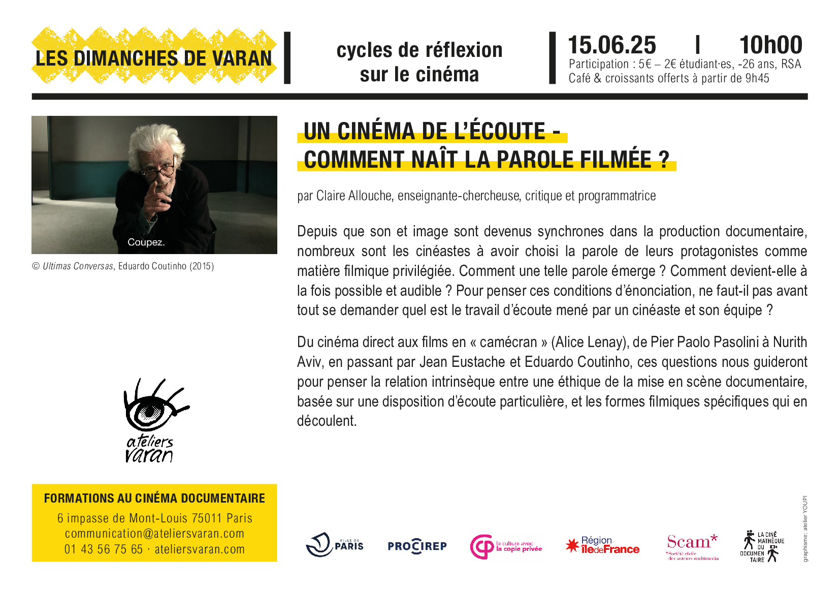 - Café et viennoiseries offertes à partir de 9h45. Début de la séance à 10h.