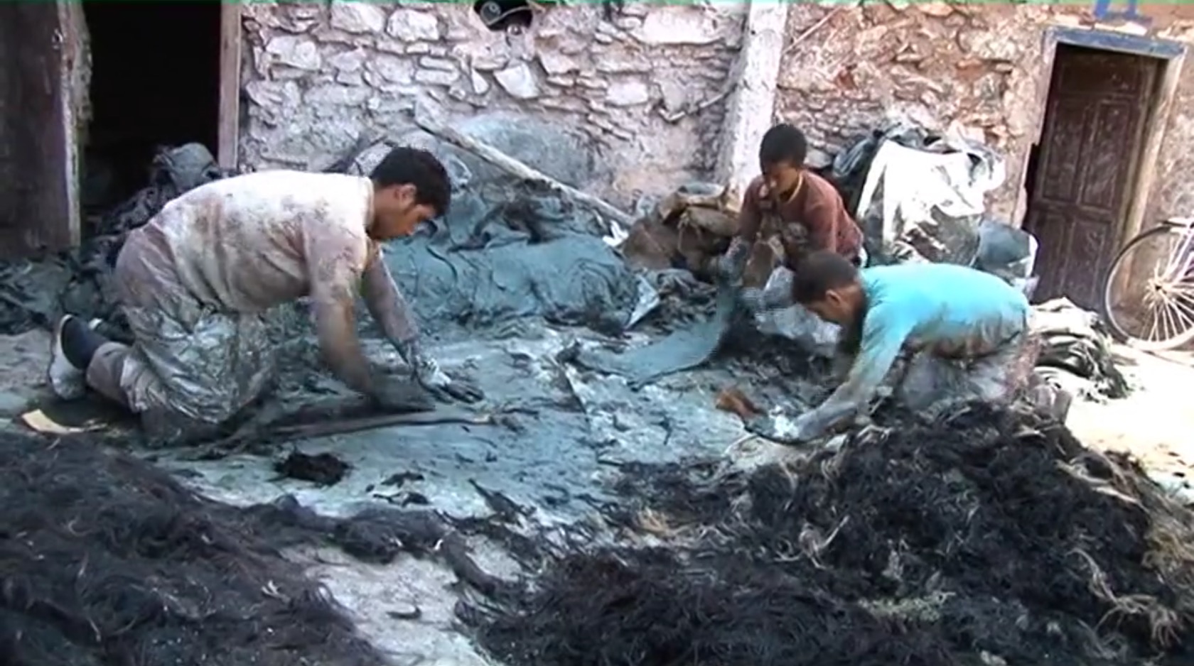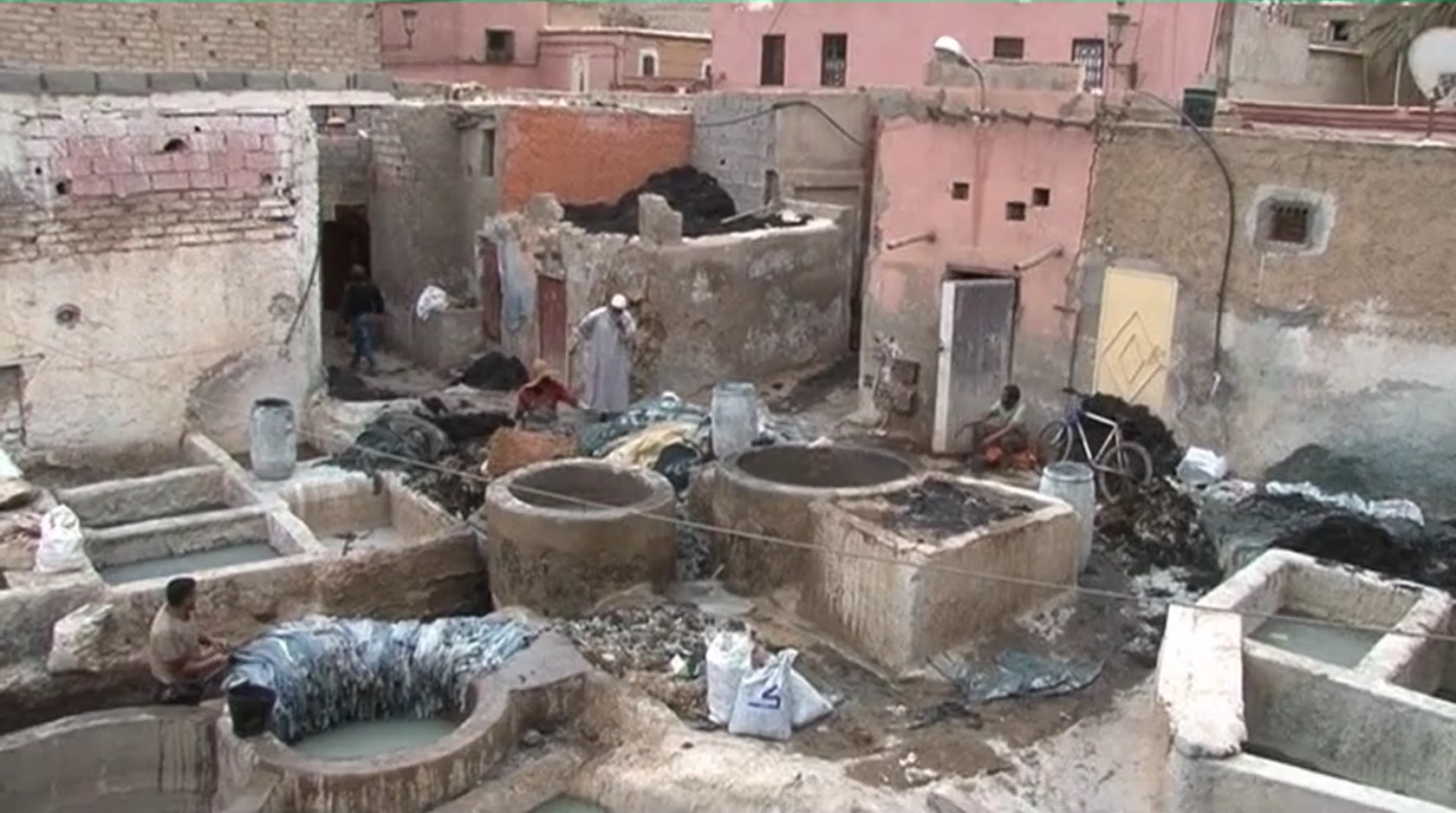 La vie quotidienne des tanneurs dans une tannerie à Marrakech.