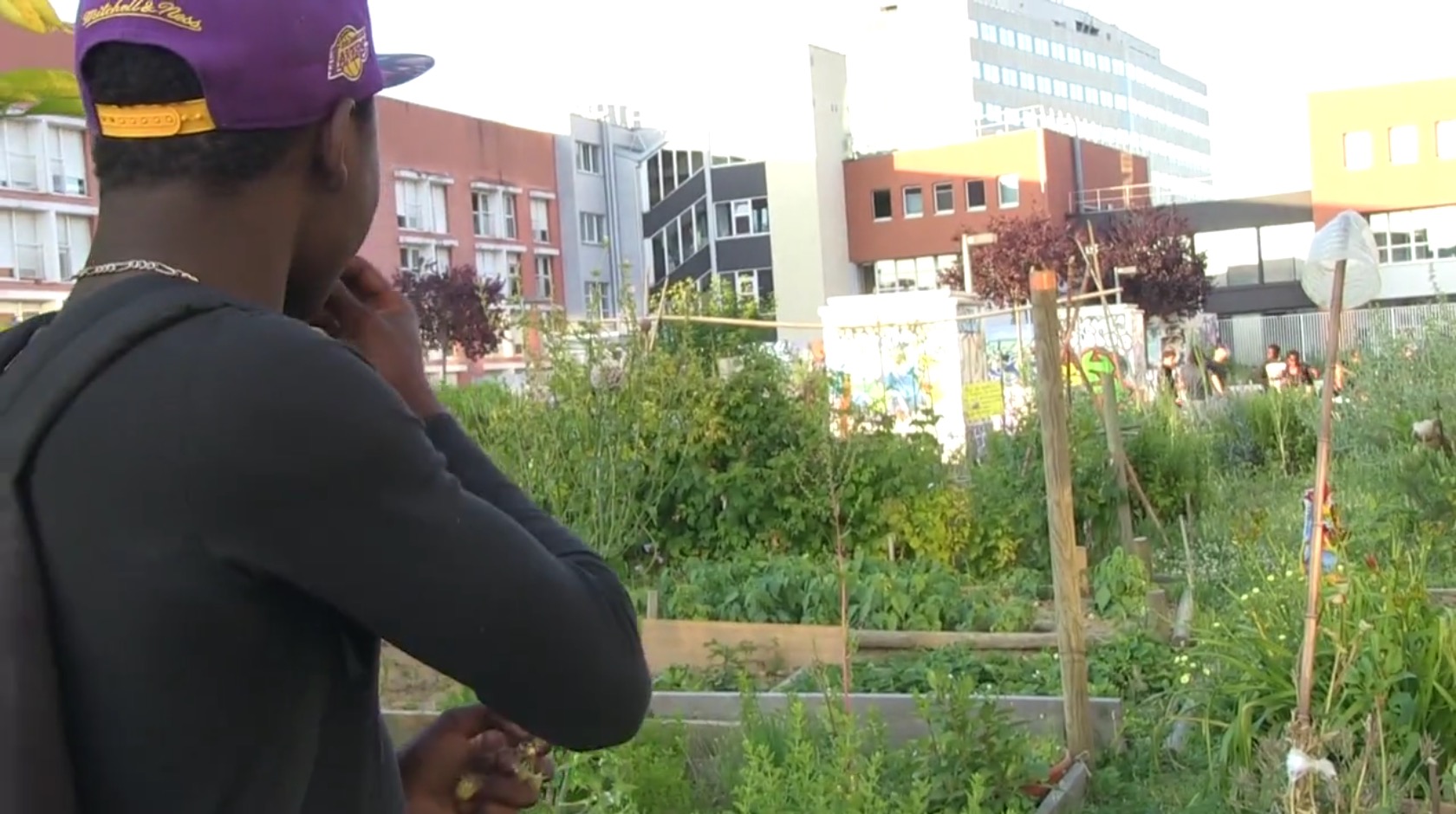 "J’ai réalisé ce film pendant les 7 semaines qu’a duré la formation Varan. J’y ai découvert ce lieu aux hasards de déambulations à la recherche d’un jardin partagé. J’avais repéré sur internet qu’il y en avait un tout proche de mon travail, près du périphérique de la porte de Montreuil. Mais je ne l’avais jamais vu. Et pour cause, il est perché sur le toit d’un magasin Décathlon. Sur cette grande dalle de béton, à l’abri des regards des passants, un coin est réservé à une association de femmes qui viennent jardiner leurs petits lopins de terre. Bien d’autres espaces côtoient ce jardin : une remise, un terrain de foot, une aire de jeu pour enfants, la terrasse du café Décathlon, des espaces vides, des recoins et des murs de toutes les hauteurs. Chaque espace est investi par son public. Les ados du quartier viennent trainer ou jouer au foot, des danseurs de Crump répètent en musique sur la dalle, des apprentis yamakasis viennent faire du parcours sur les rambardes et les murs que les graffeurs recouvrent inlassablement de leurs bombes. Tout ce petit monde cohabite sur ce terrain, à l’abri des regards, se partage tacitement l’espace, se frôle sans réellement se côtoyer, si ce n’est pour venir voler quelques framboises dans le jardin des femmes…